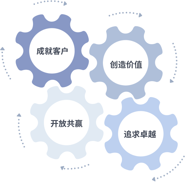 成就客户是一切决策的出发点,创造价值是衡量所有工作的标准,追求卓越是GA黄金甲做事做人的态度,开放共赢是GA黄金甲的格局也是最终的结果。价值观的齿轮环环相扣,推动着组织里的每个人不断向前。